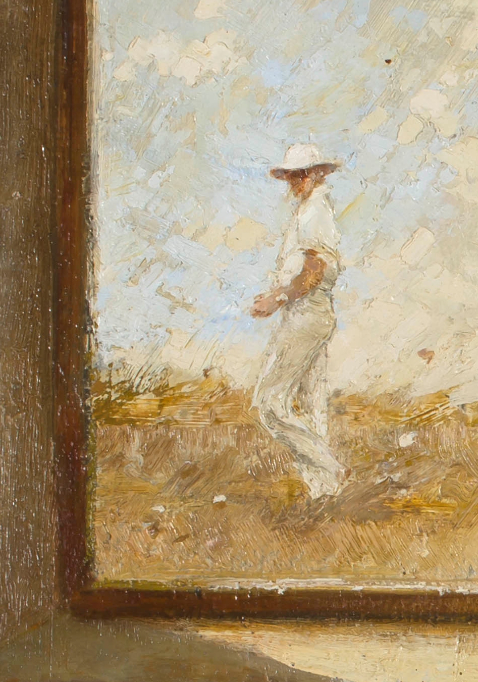 Notes : ‘My paintings are all consciously rendered to give the impression of reality but are based largely on recollections of disparate memories. The subject matter in this work derives from the observation of winter sunlight streaming through the studio window. The figure seen through the window had perhaps been sitting in the chair and now confronts the viewer (or himself) from the outside in a metaphysical way.’
