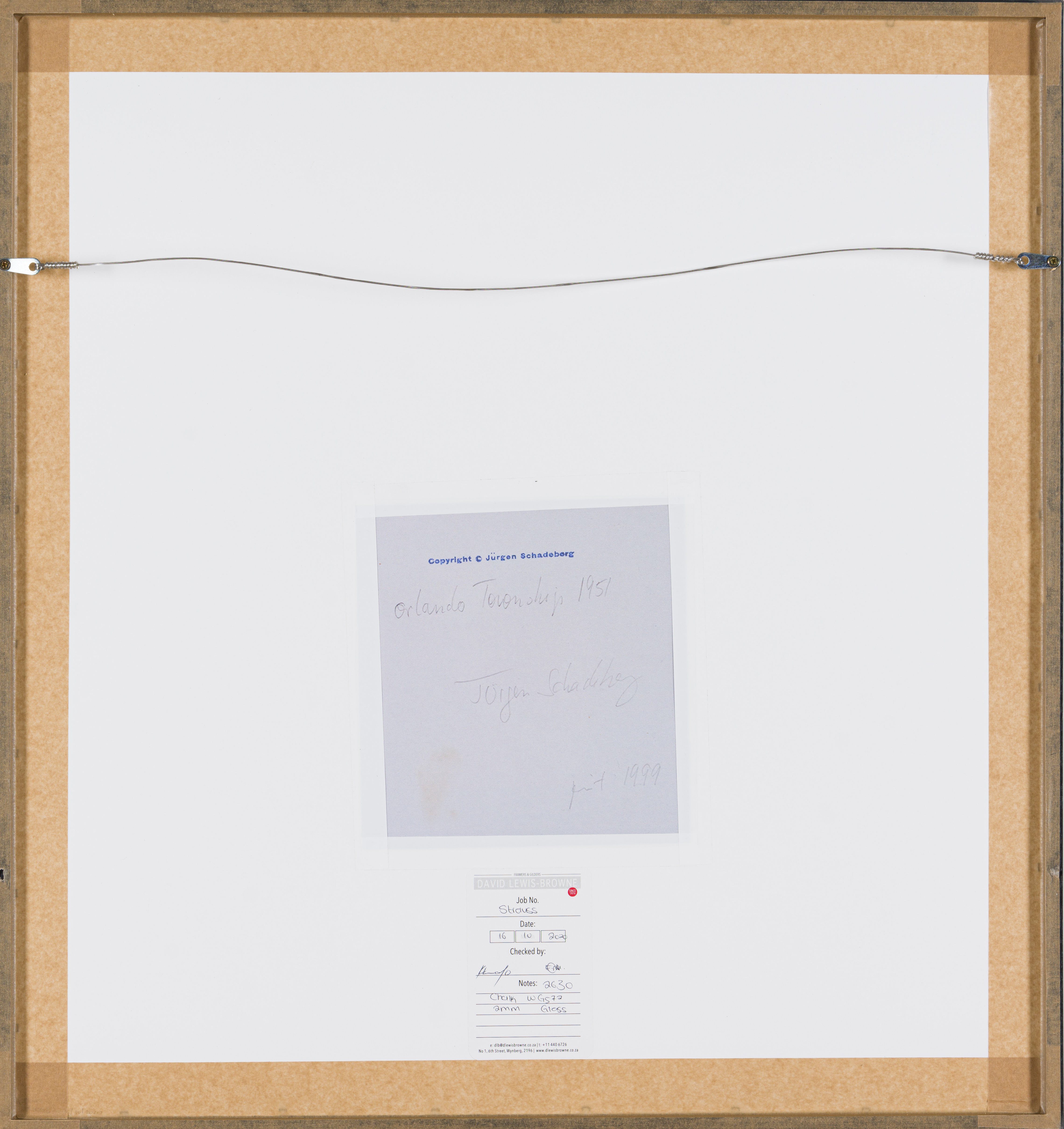 Medios: selenium toned darkroom print 1/1 (unique) Talla : sheet size: 61 by 50,5cm; 66 by 61,5 by 2,5cm including frame Firma: signed, dated 1999, inscribed with the title and embossed with the Jürgen Schadeberg chopmark in the margin; inscribed with the artist's name, the title and 'print 1999' and stamped 'Copyright Jürgen Schadeberg' on the reverse