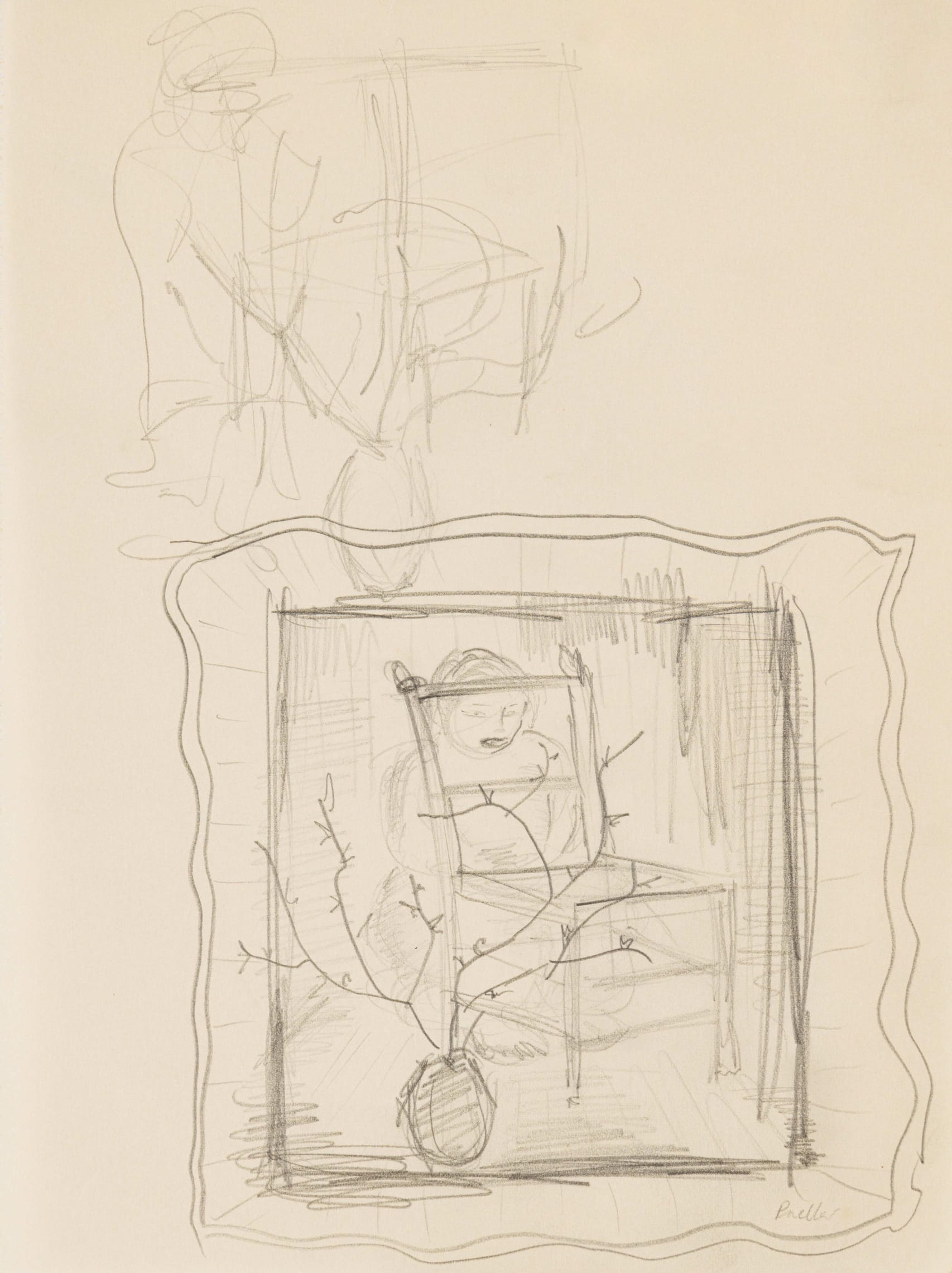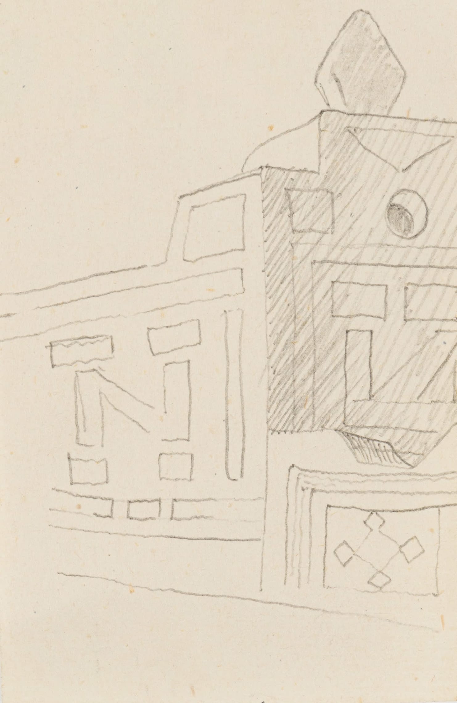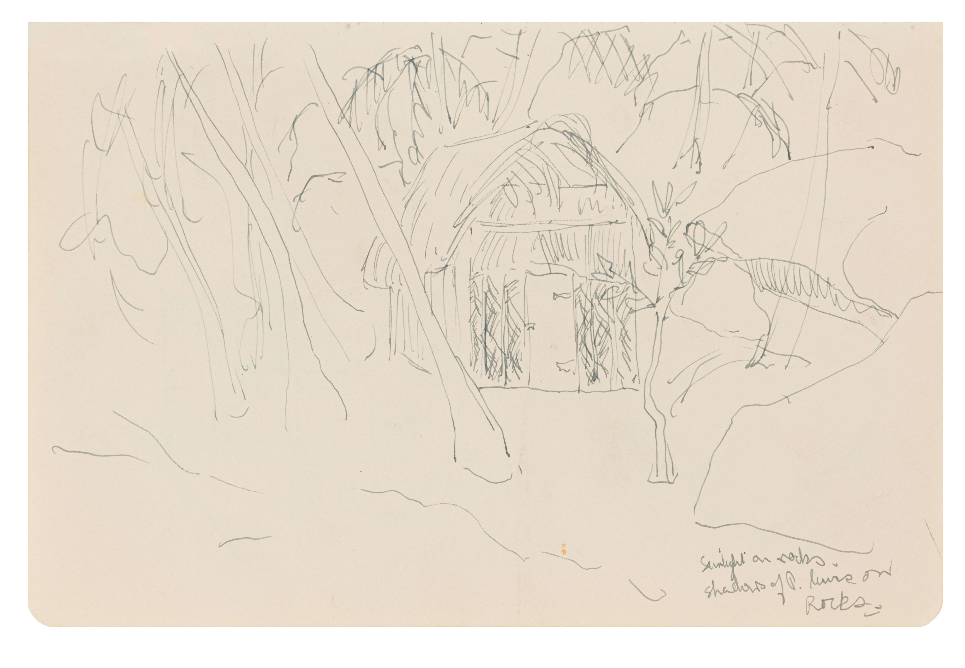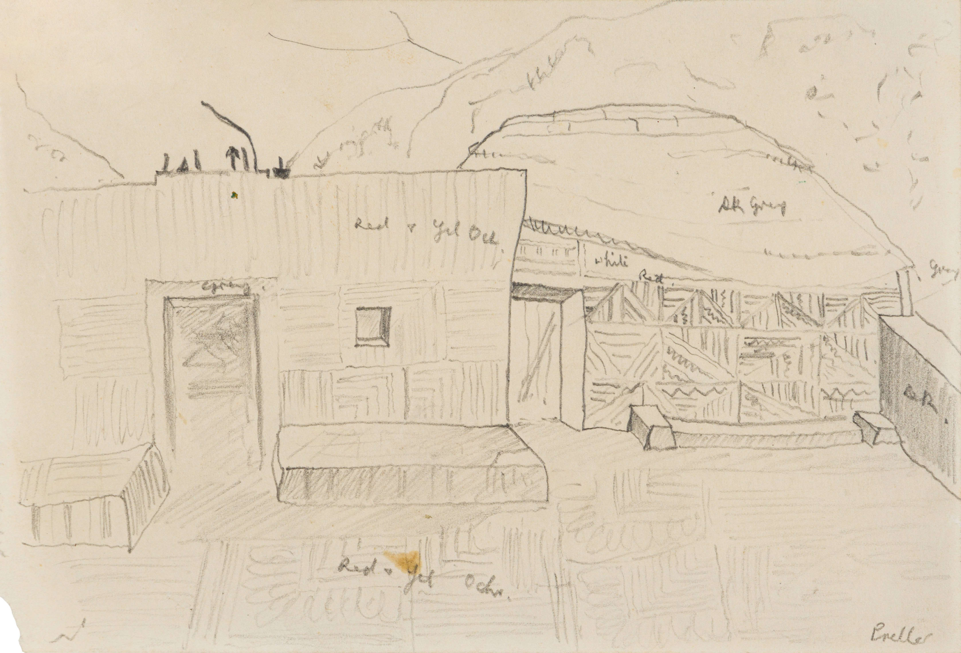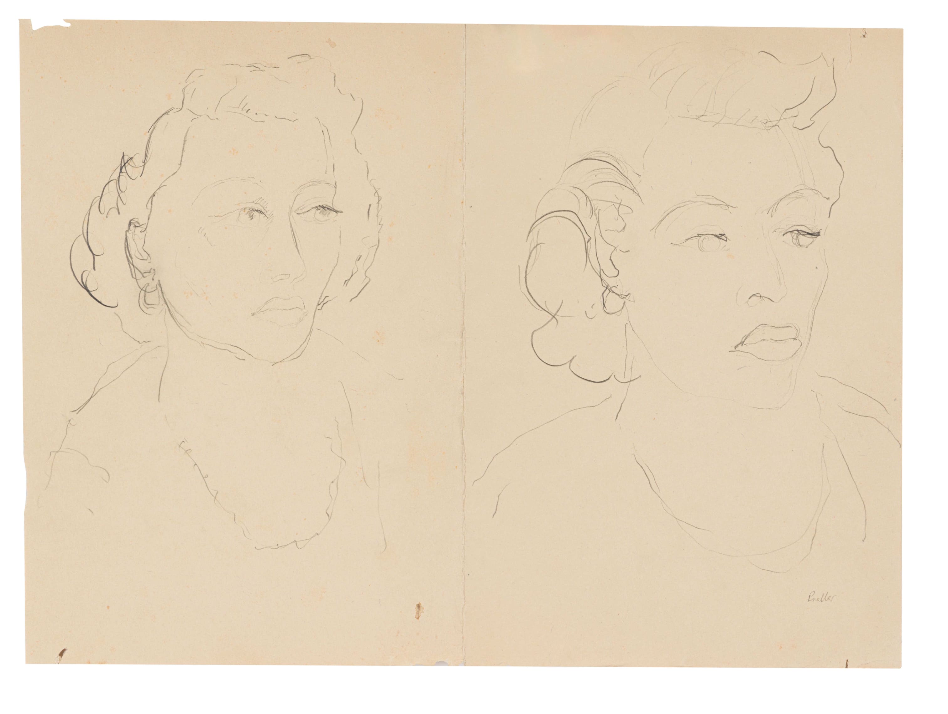 7. Collection of sketches: Two Portraits recto, Portrait of a Woman, verso, Landscape with Hut and Palm Trees, Interior with Chair, Ndebele (Mapogga) Dwellings, two, pencil and ink on paper, oxidised, minor tearing in areas and minor surface dirt.