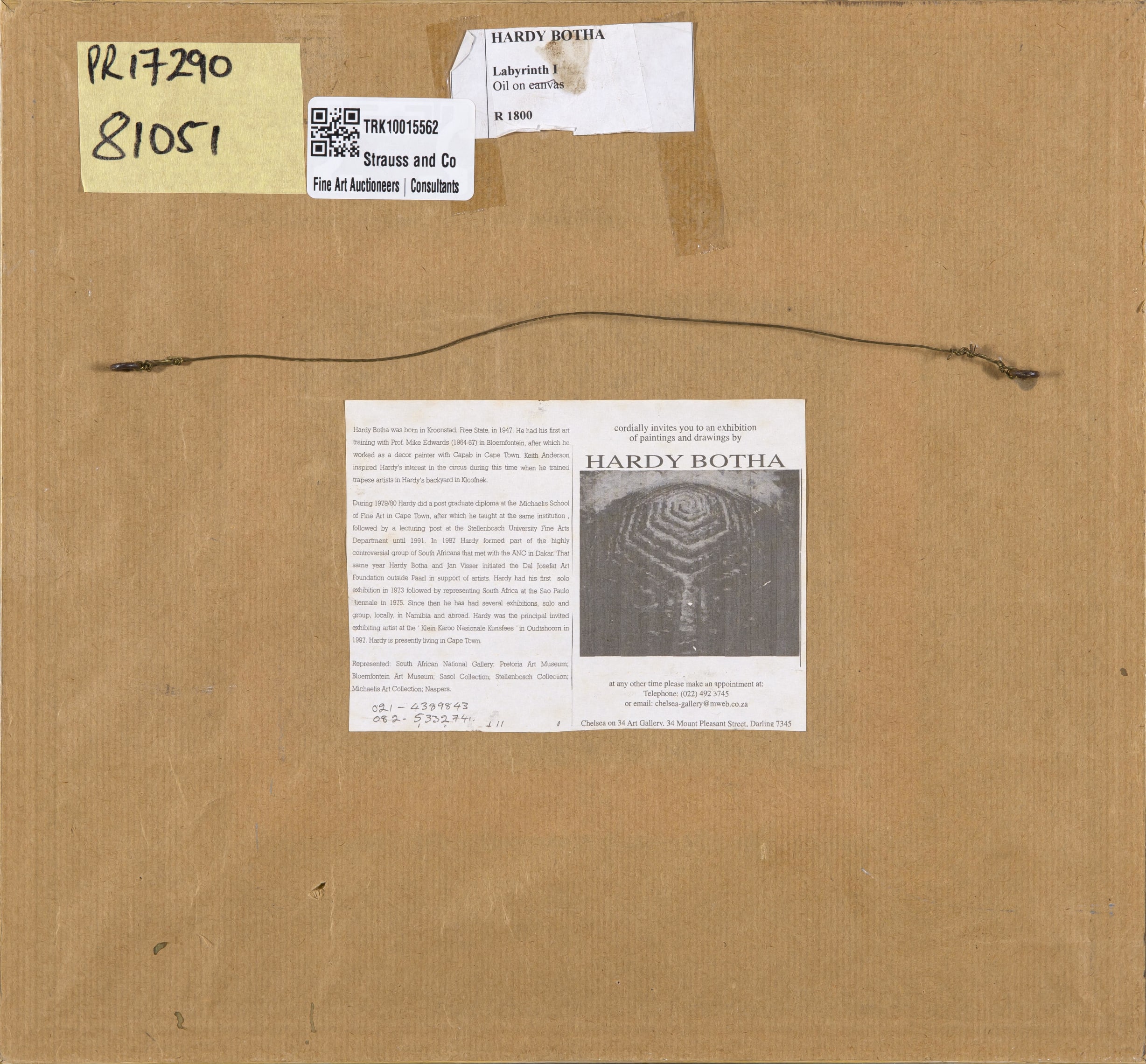 Medium: oil on board Dimensions : 14 by 16,5cm excluding frame; 34,5 by 37,5 by 3,5cm including frame Signature: signed and dated 85; inscribed with the artist's name, the title and medium on a label adhered to the reverse; accompanied by a photocopy of the exhibition invite for Paintings and Drawings by Hardy Botha, Chelsea Gallery, adhered to the reverse
