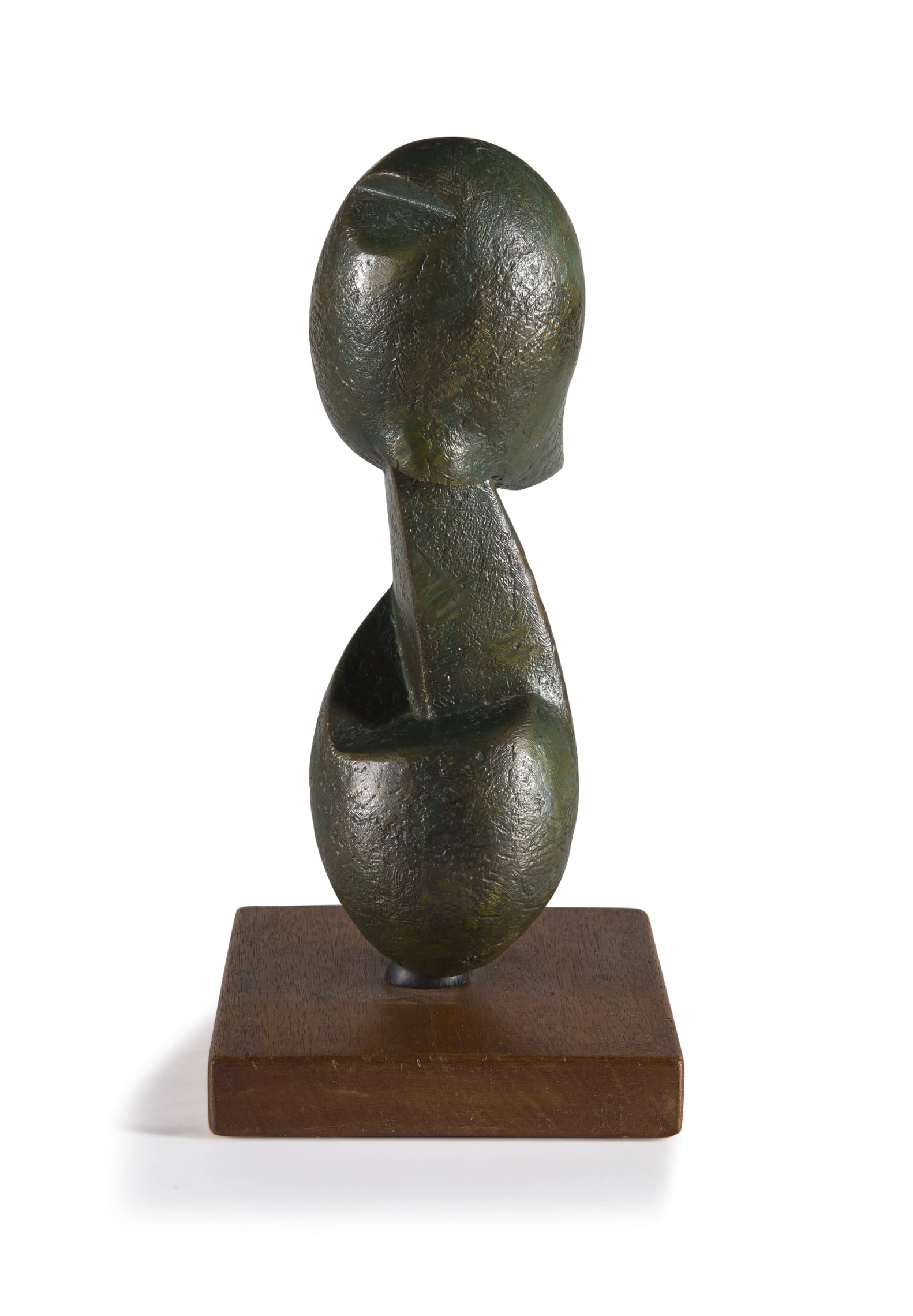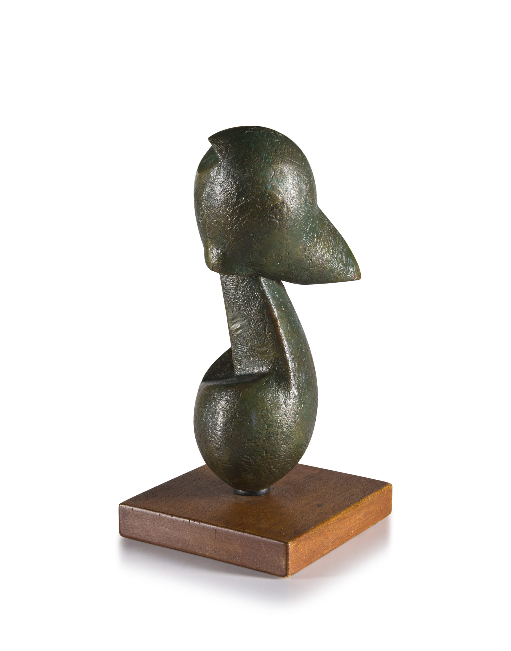 Medium: bronze with a green patina on a wooden base Dimensions : height: 32cm excluding base, 35cm including base, width: 9,5cm, depth: 14cm Signature: signed and dated 86